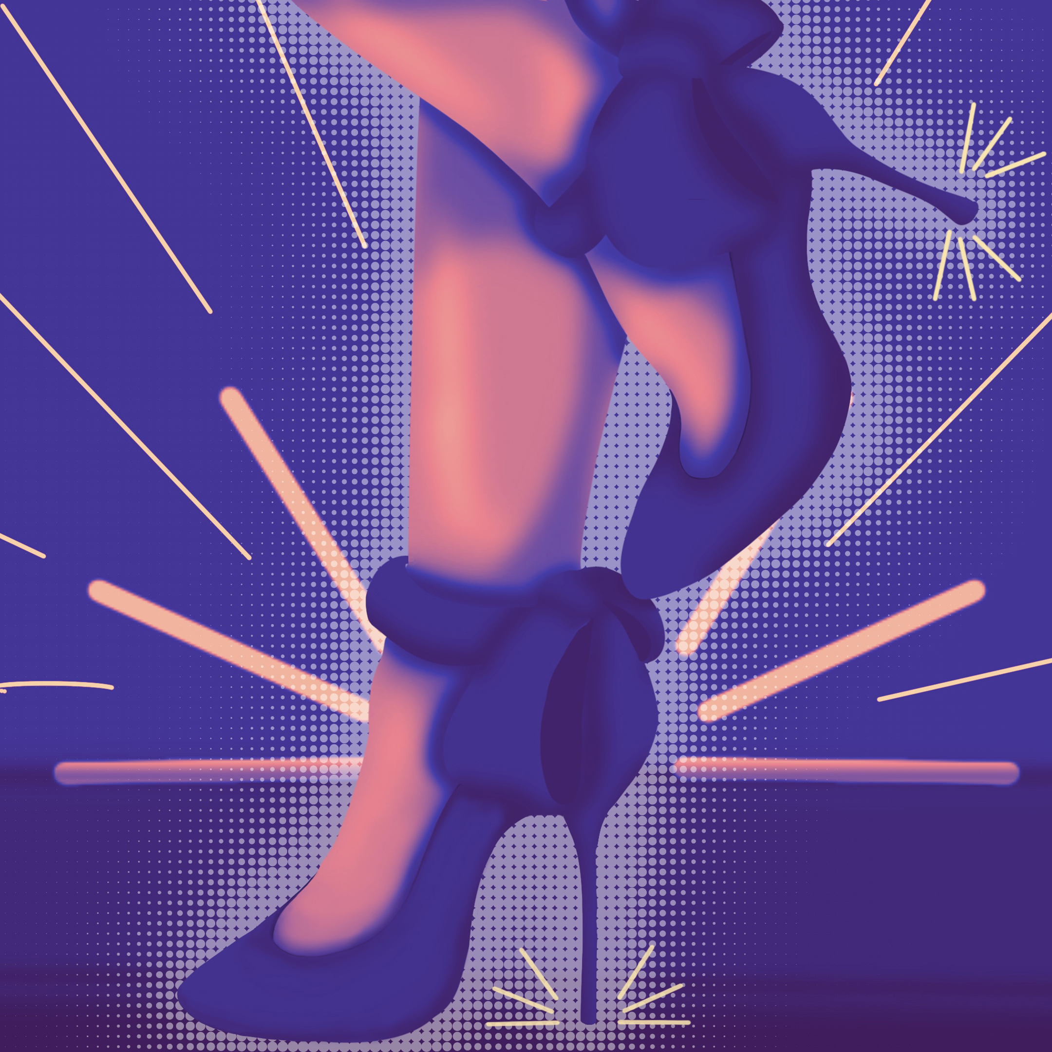 “I chose to depict the noise heels make when they strike the dance floor,” Hall said. “I believe the stark contrast between the cool blue and the warm peach hues, along with the halftones bordering the legs help to give the piece the perfect 70s disco aesthetic.”