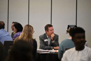 Dr. David Tillman talking with a group of students.Small group collaboration at a table during conference.