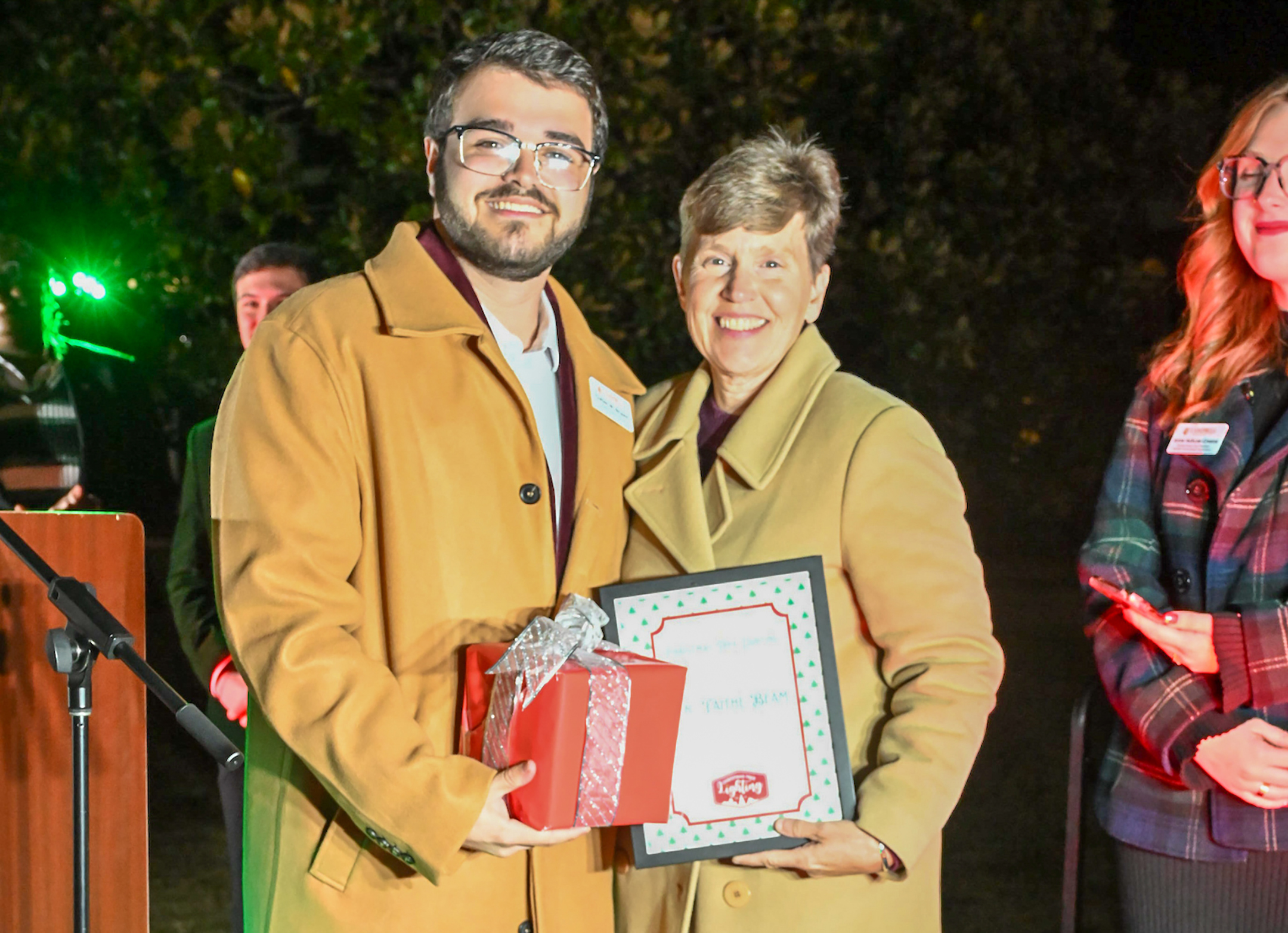 The ceremony began with remarks from Student Body President Cutler Bryant, who reflected on tradition, community, and the symbolic importance of shared light: “And the same spirit that gathered a group of students and faculty on that first November night, is the same spirit that gathers us here tonight — surrounded by colleagues, classmates, friends and family, on a campus that feels like a community … As we prepare to light this tree, I hope it reminds you to be the light in our community. I hope it reminds you that the same light that shone 2,000 years ago still shines in this community and won’t stop shining anytime soon.”