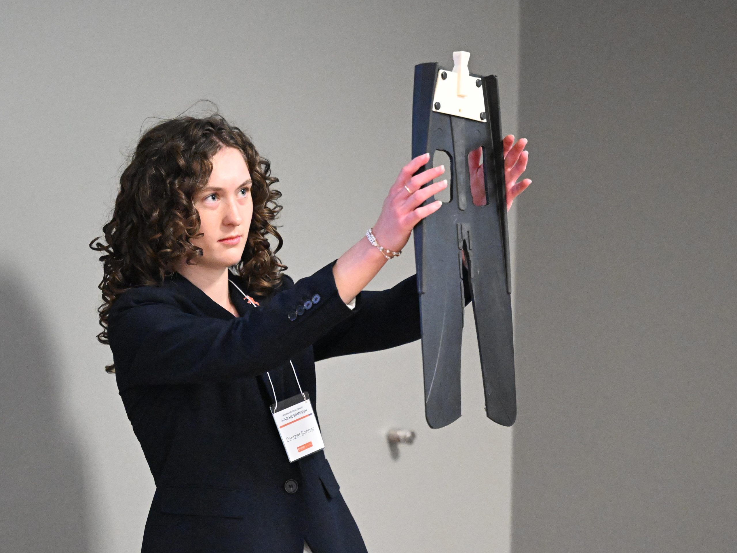 One of the more compelling oral presentations was delivered by three engineering students — Dantzler Bonner, Noah Baker and Sarah Fitzkee — who worked with physical therapy students this year to develop swimming fins for a bilateral transfemoral amputee who wished to return to swimming. The engineering and PT students collaborated to design and fabricate fins that connected to the man’s prosthetics.