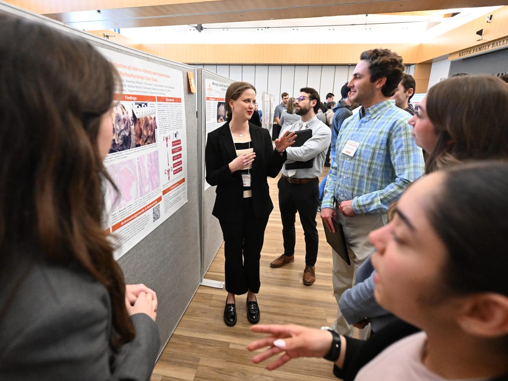 Poster presentations were on display later in the afternoon in the Oscar N. Harris Student Union’s Keith Family Ballroom. Ainsley Forest’s research on vaping and its increased risk of causing blood clots examined a 45-year-old man with a recent history of heavy vape usage. Forest, a second year student in the Jerry M. Wallace School of Osteopathic Medicine, said she focused on the subject, because of vaping’s popularity and the lack of research that’s gone into its dangers.