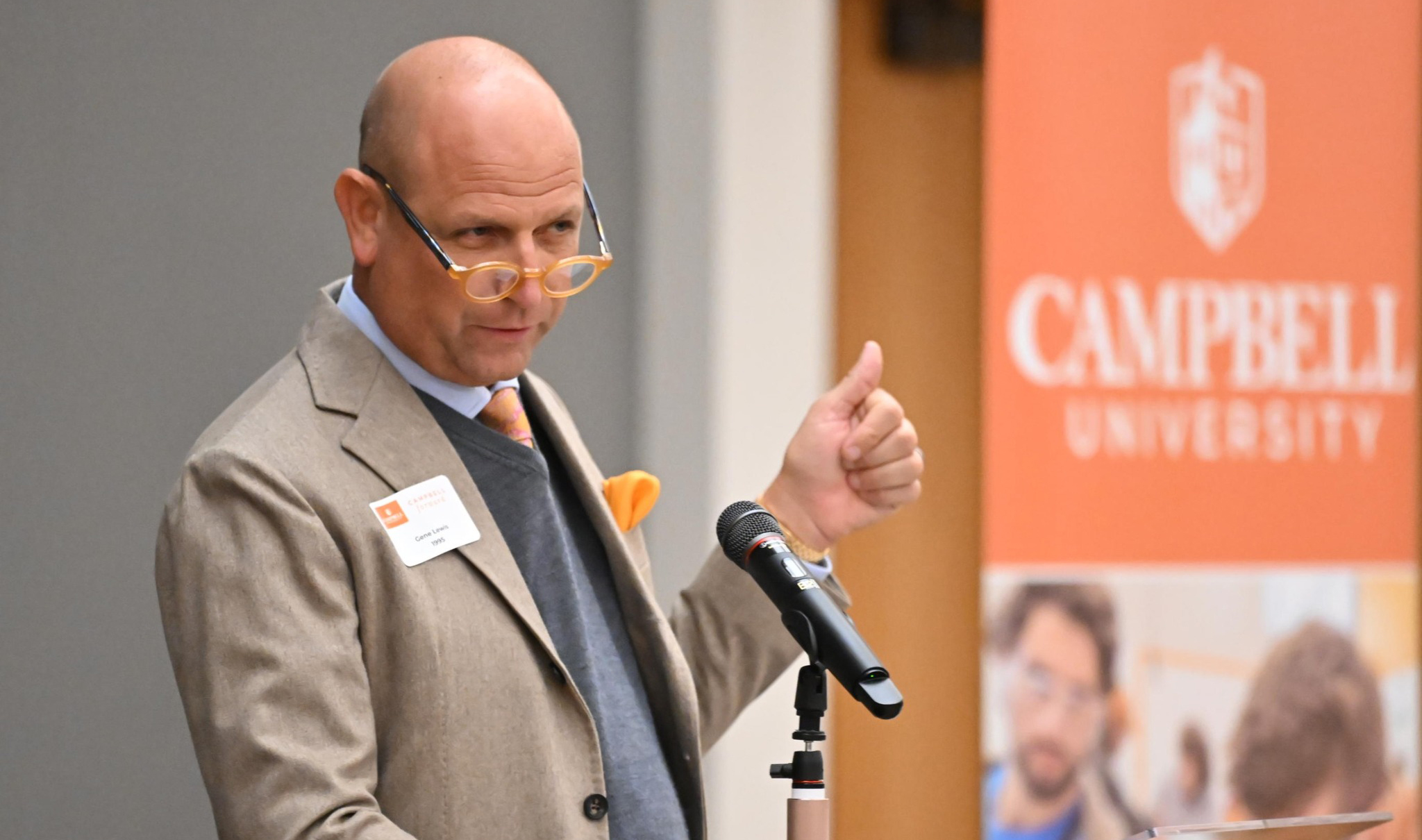 As he was before he spoke at other stops on the Campbell Forward tour, Downs was preceded at the podium by an alum and/or a current student in Buies Creek. This time, it was both. Alumnus Morgan Timiney, vice president and board member for Campbell’s Alumni Association and a two-time Campbell graduate now working as a chassis engineer for Caterpillar, delivered the invocation, and Cutler Bryant — president of Campbell’s Student Government Association — shared his testimony on the impact Campbell has had on him over the last three-plus years.