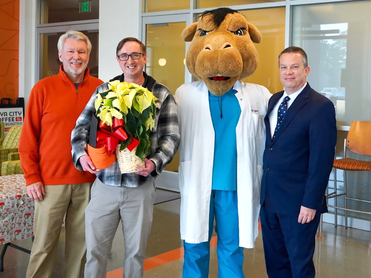 David Hosea and Janice Taylor were surprised during staff Christmas luncheons this month with visits from President William M. Downs and mascots Gaylord and Gladys after both were named recipients of the Cherished Camel award.