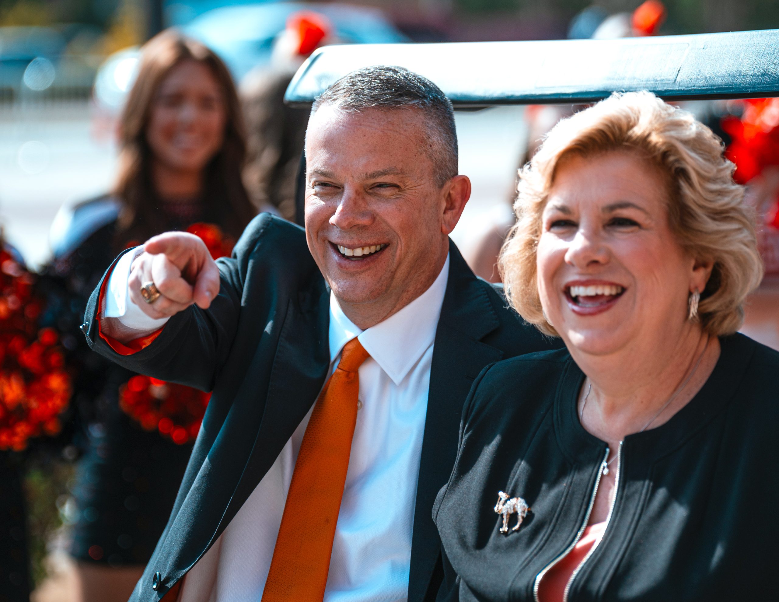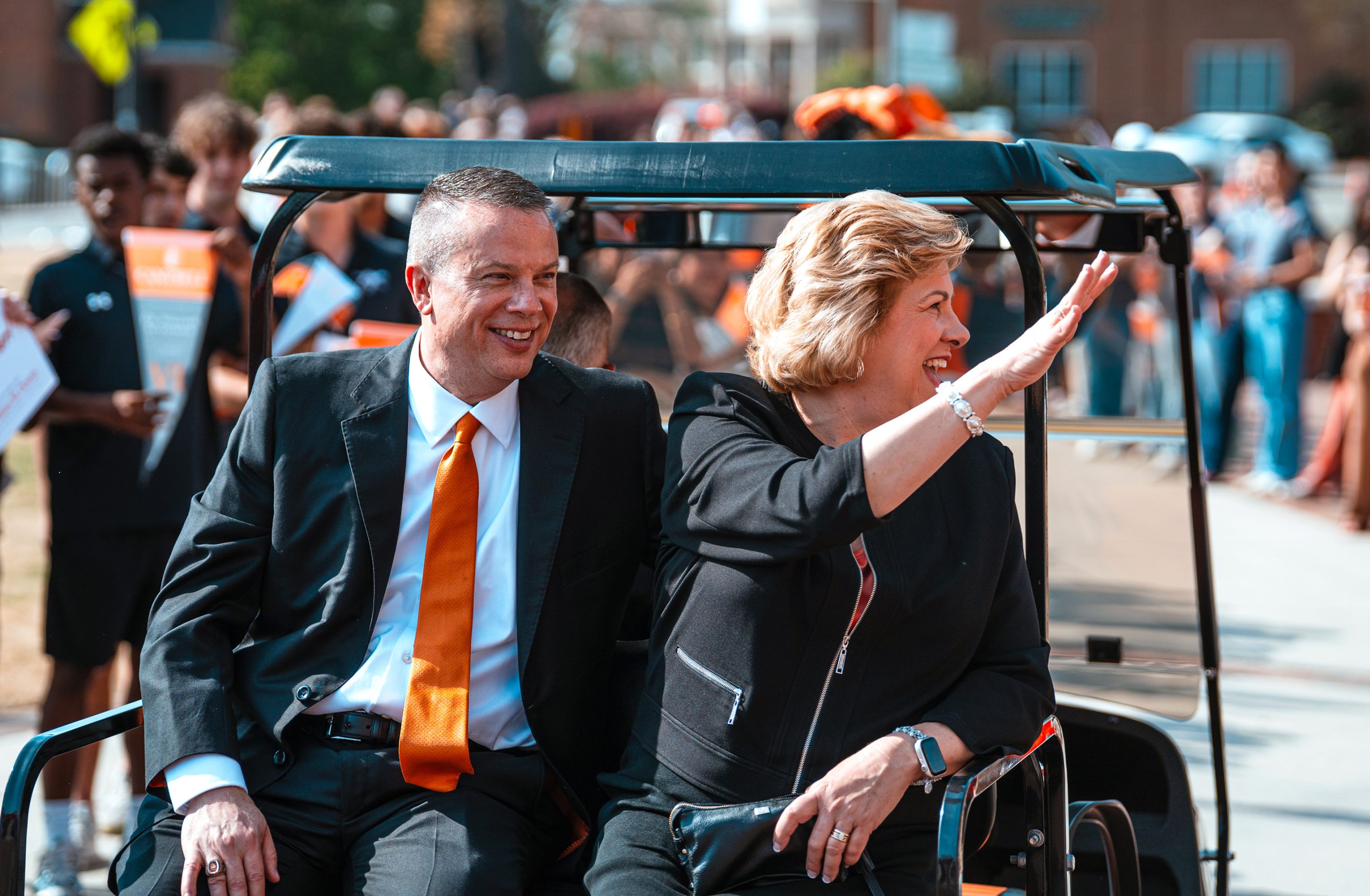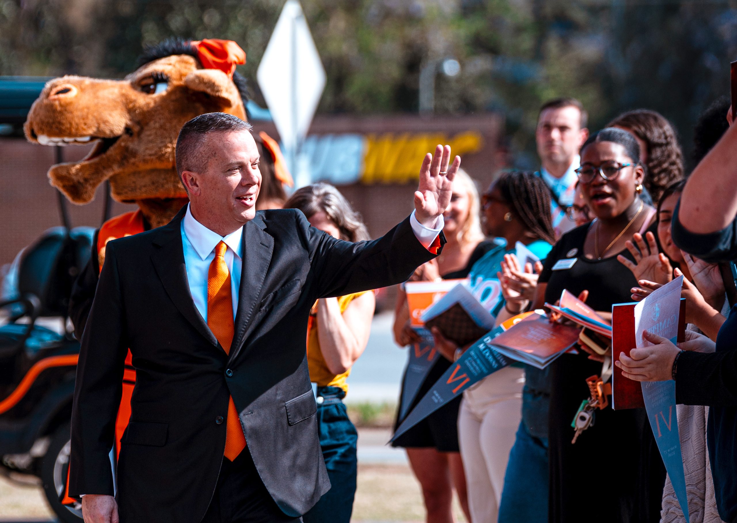 Hundreds more students formed a line from the convocation center to the Oscar N. Harris Student Union, holding signs, pennants and banners congratulating the president and First Lady Kimberly Downs as they paraded through the line on the back of a golf cart.