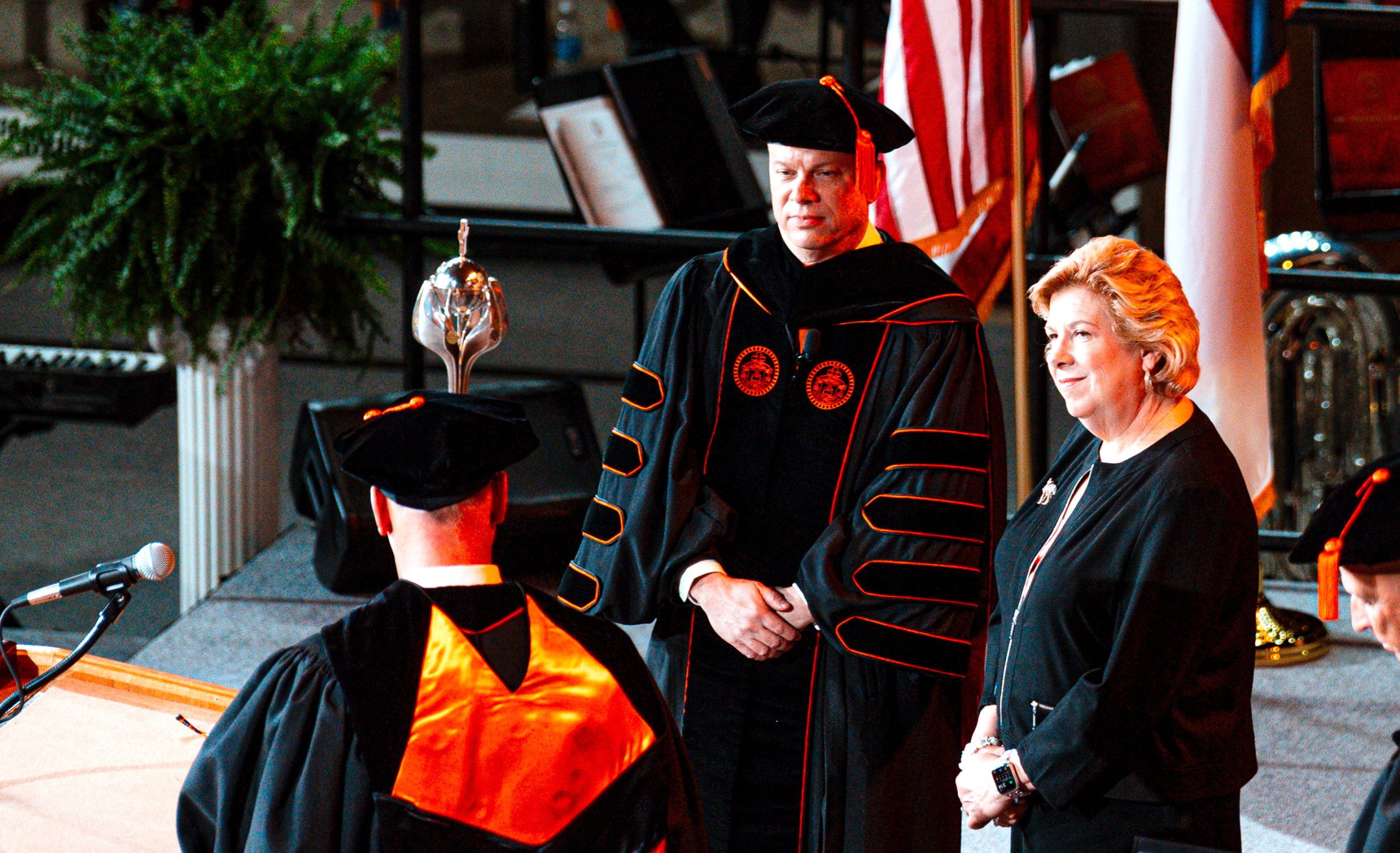 More than 1,600 delegates, faculty, staff, students, community members, family and friends were on hand for the Investiture Ceremony held on the floor of Gore Arena inside Campbell’s Pope Convocation Center. The event capped six days of build up for Inauguration Week in the form of a worship program, academic lecture, student research symposium, dedication ceremony for the campus’ 300-year-old oak tree, day of service and campus-wide cookout.